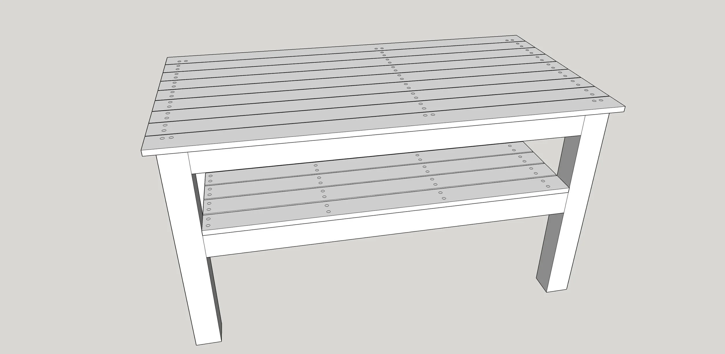 You may recall that way back in step one I didn't provide the lengths for the shelf or top slats. There's a reason! I find it best to measure after the completion of Step 4. This way you know exactly what you need. If everything has gone to plan, you should be cutting the Shelf Slats (E) at 50.5 inches. You should also be cutting the Top Slats (F) at 60 inches. Note: the 60 inches for the top slats account for an overhang around the table. You may want to just keep the Top Slats (F) at 60 inches and just have the overhang vary. You should definitely take a new measurement for the Shelf Slats (E) to assure they will fit.